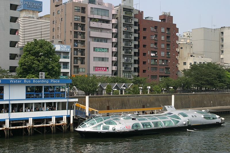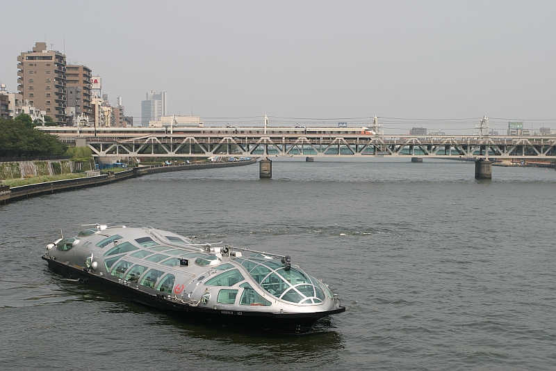| Himiko leaving the pier in Asakusa. The train in the background is Tobu Isesaki Line.