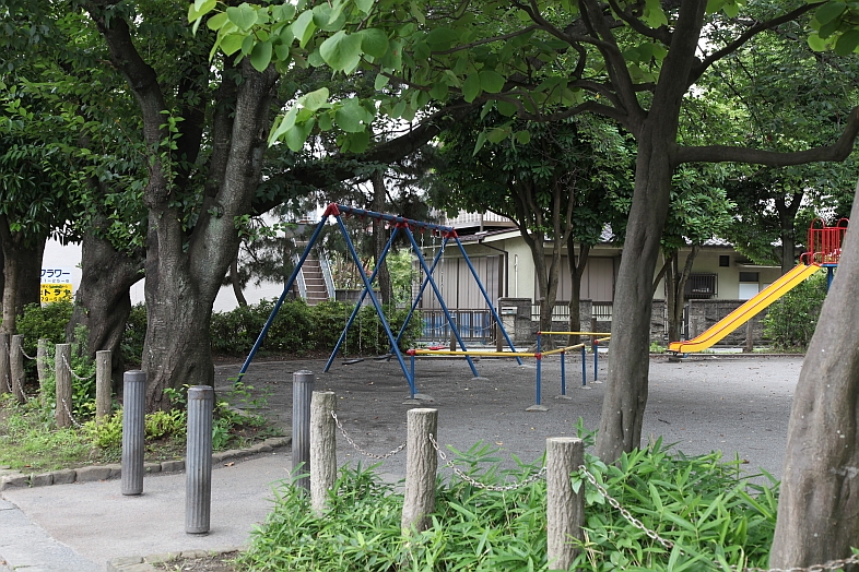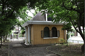 | Kamenoko Children Park : park toilet at the left, and the white house at the right is supposed to be Furukawa Bakery