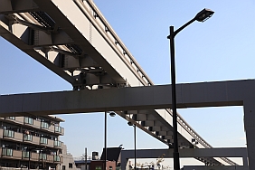 | [R1-OP1] Saten posing in front of the Tama Intercity Monorail tracks near the Tamagawa-jousui station