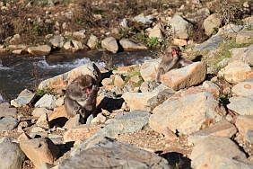 | Monkeys sitting beside the river near the hot spring | Monkey resting after a good hot spring dip | Monkeys sitting at the hill side near the hot spring |