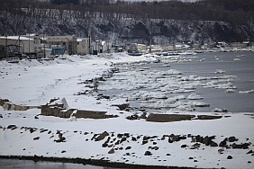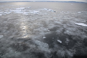 | Looking back at the Abashiri city | Drift ice near the light house | The sun is setting, making the sea golden |
