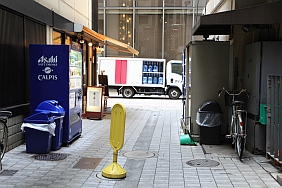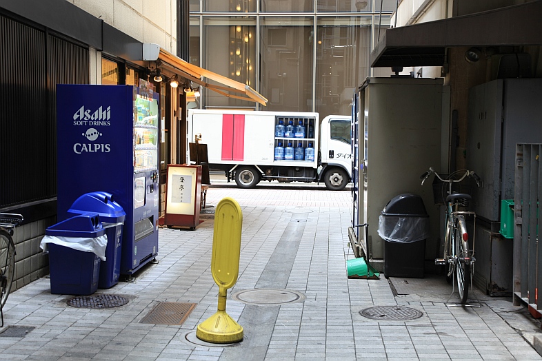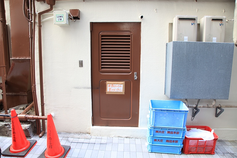 | [EP01] In the alley, Rikuo and Masakazu looking at the front door of Eve no Jikan. In real life, it is a back door of the building