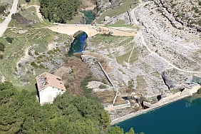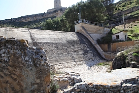 | From the stone wall surrounding Del Campo Tower looking back at the Castle of Alarcon and the river/dam/old house/bridge