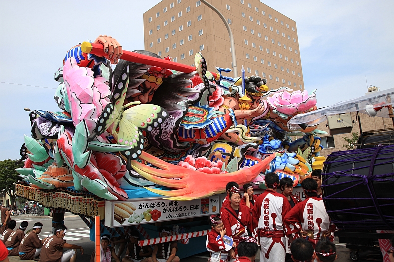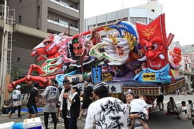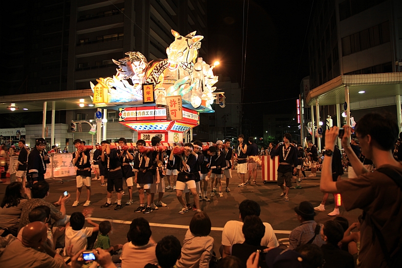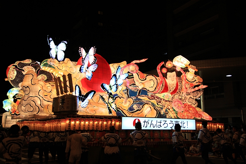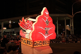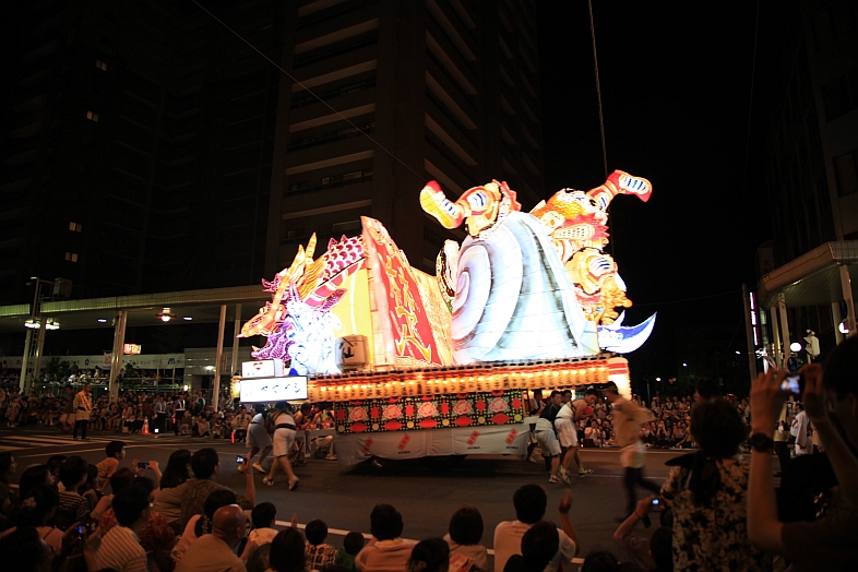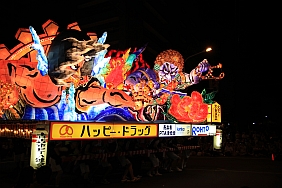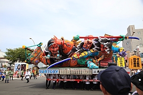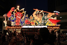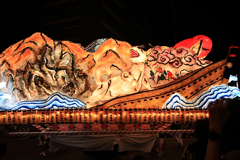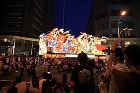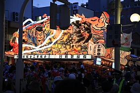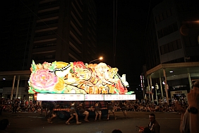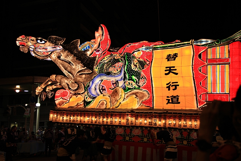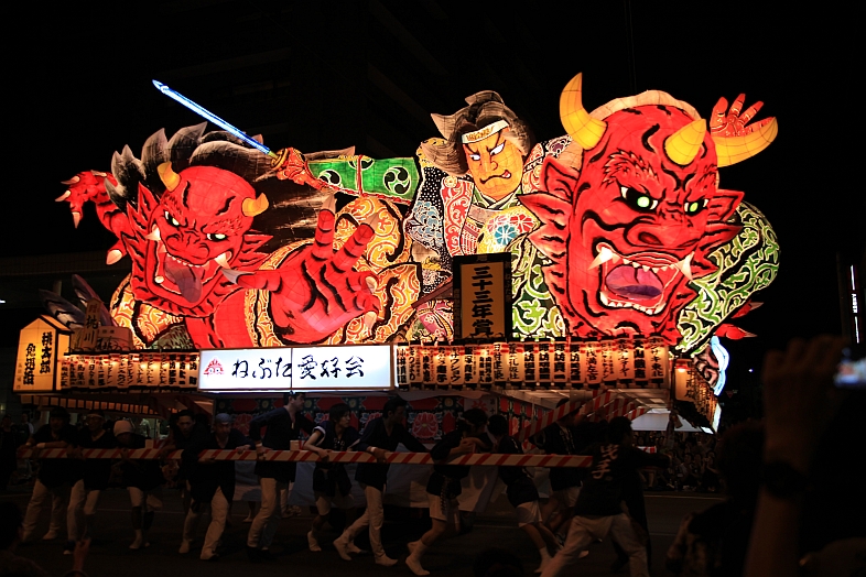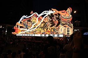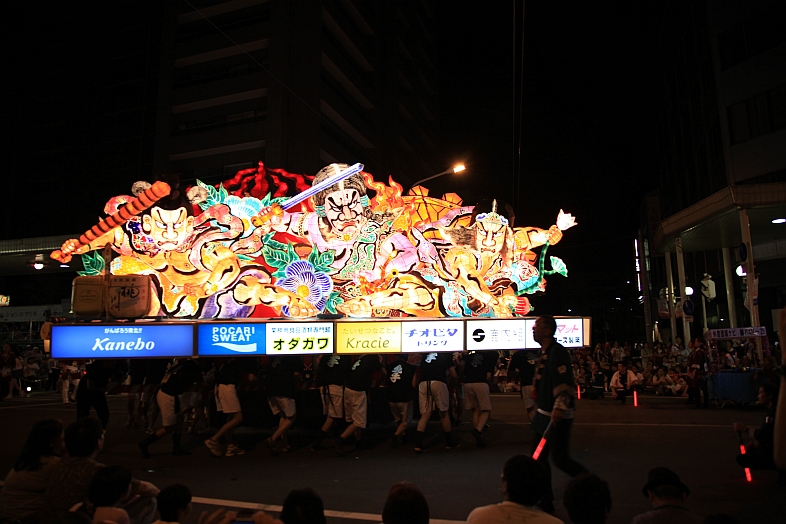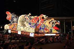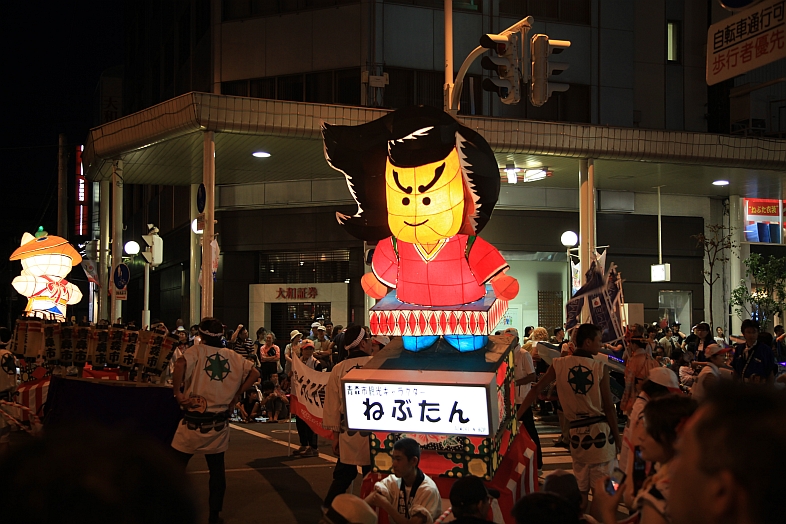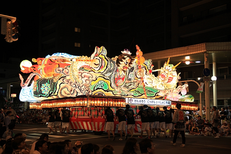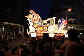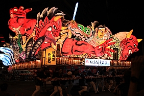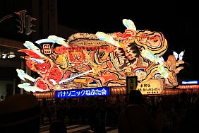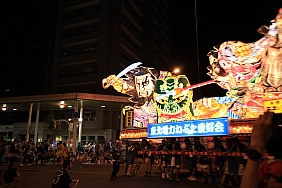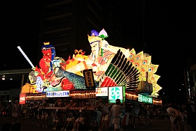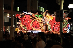 Aomori Nebuta Festival is being held in Aomori City, Aomori Prefecture, between 02-07 August each year. The main attraction of the festival is the night parade of : * Nebuta Dashi (Nebuta 山車, cart carrying the Nebuta) * Hayashi (囃子, musicians), mainly consists of 3 types of instrument players : fue (笛, flute), taiko (太鼓, Japanese drum), and teburigane (手振鉦, hand cymbals) * Haneto (跳人, jumper/dancers, sometimes including Baketo (化人, Japanese style clown)) There are also a day time parade and night fireworks show in the last day of the festival. | ||