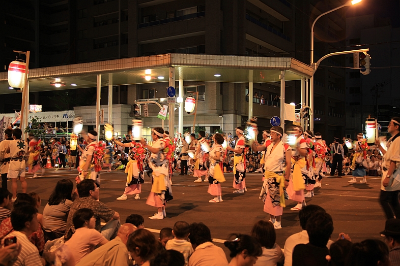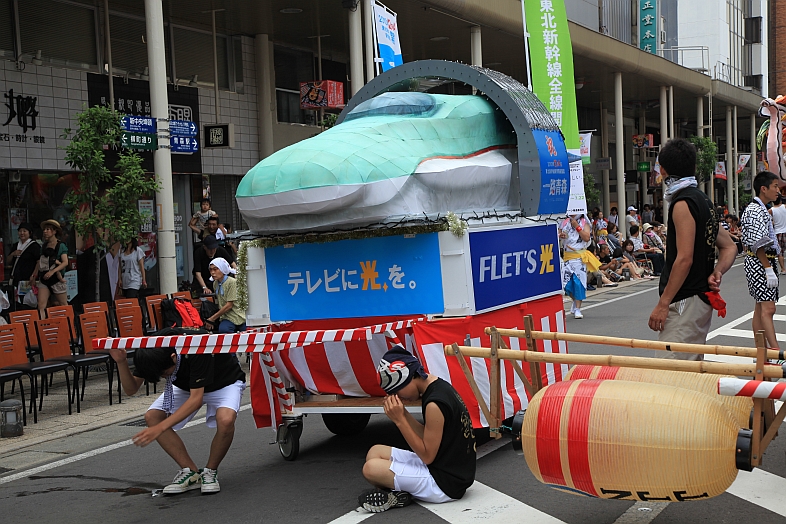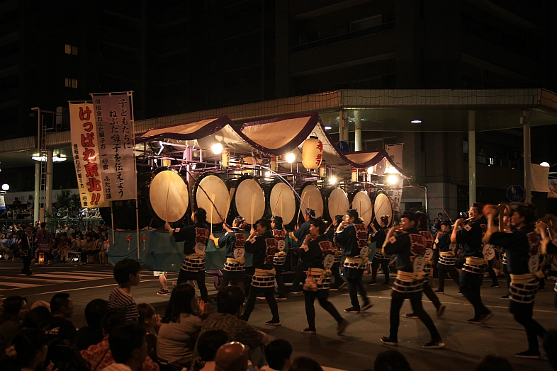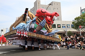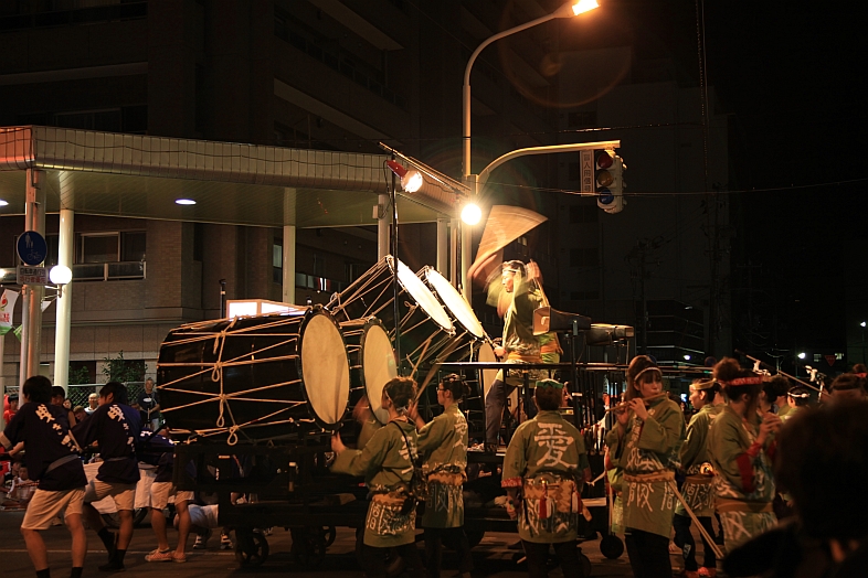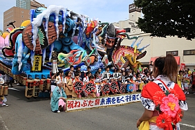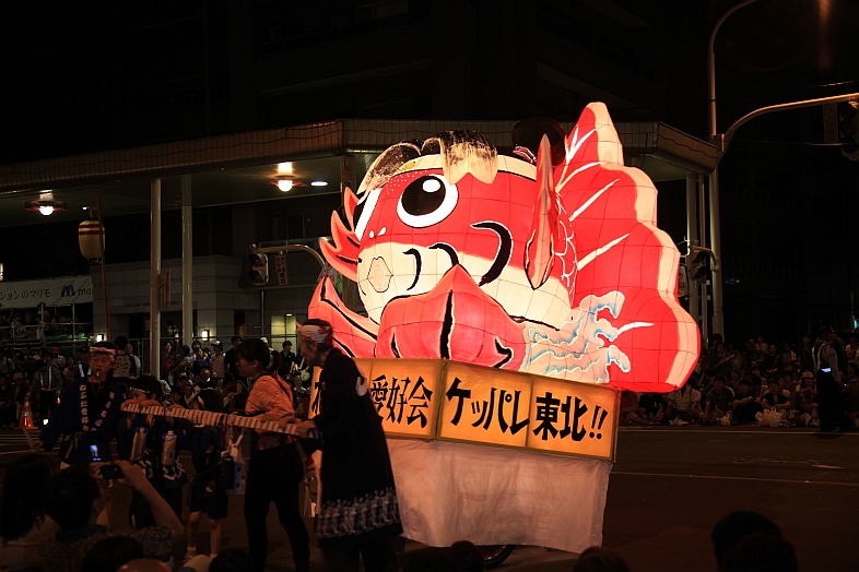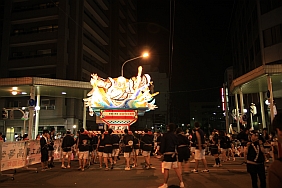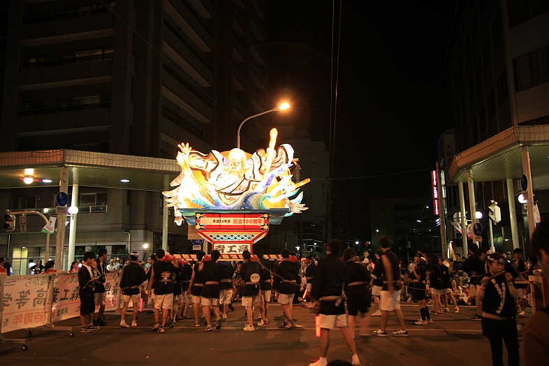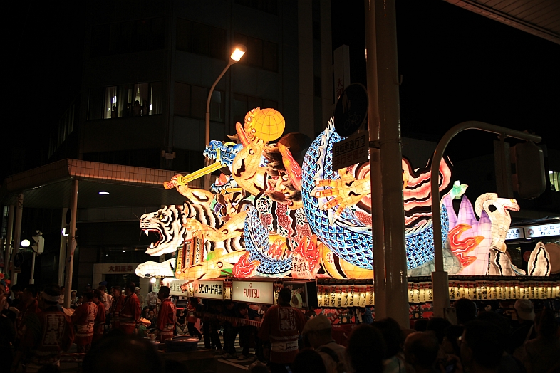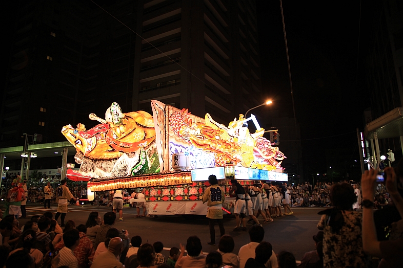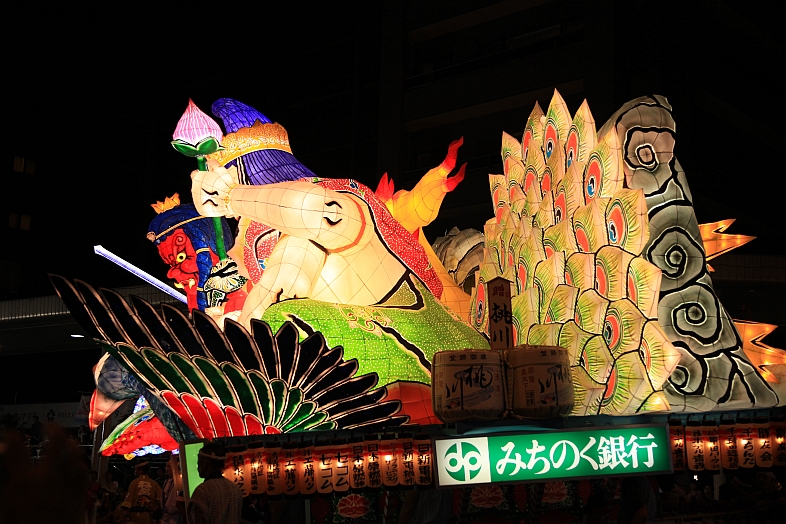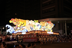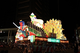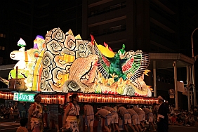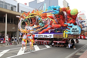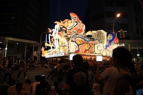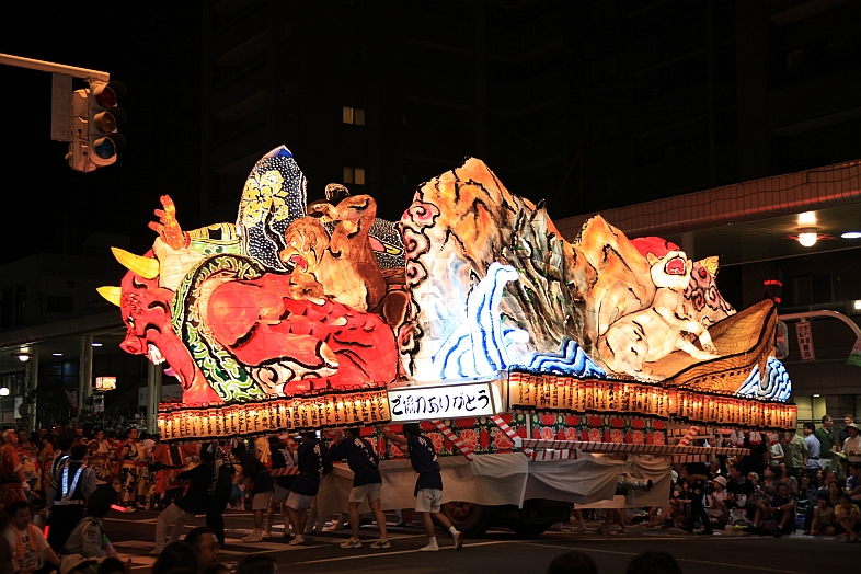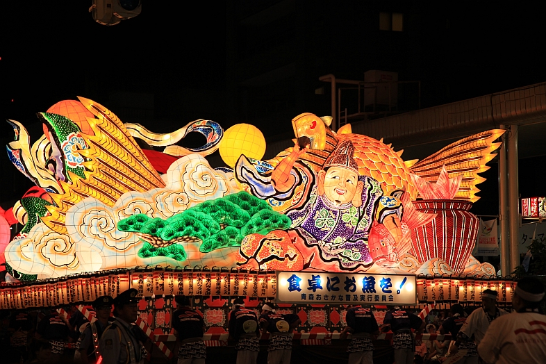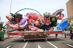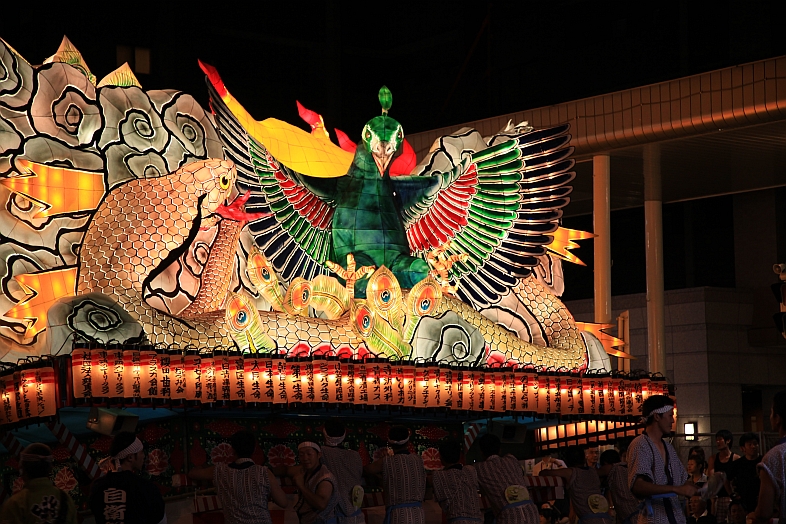Aomori Nebuta Festival is being held in Aomori City, Aomori Prefecture, between 02-07 August each year. The main attraction of the festival is the night parade of : * Nebuta Dashi (Nebuta 山車, cart carrying the Nebuta) * Hayashi (囃子, musicians), mainly consists of 3 types of instrument players : fue (笛, flute), taiko (太鼓, Japanese drum), and teburigane (手振鉦, hand cymbals) * Haneto (跳人, jumper/dancers, sometimes including Baketo (化人, Japanese style clown)) There are also a day time parade and night fireworks show in the last day of the festival. | ||
