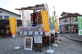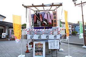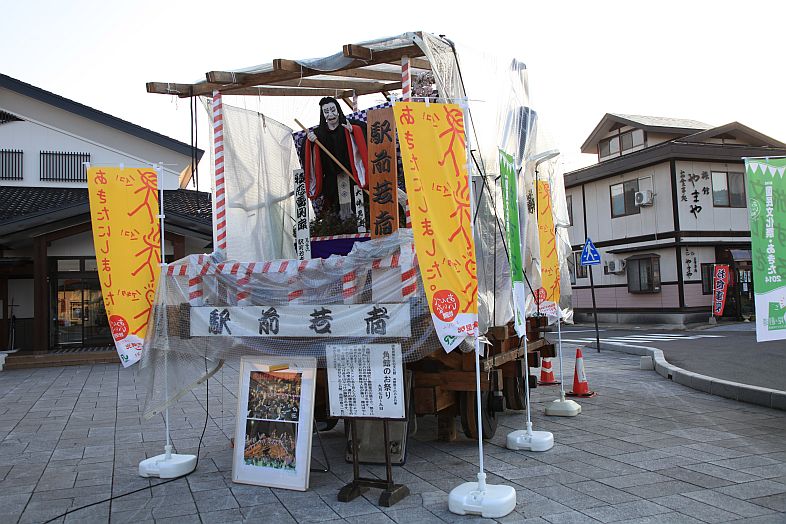 | A parade float 山車 displayed just outside the Kakunodate station 角館駅