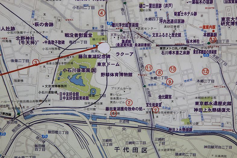 The nearest train stations are Kourakuen 後楽園 station of Tokyo Metro 東京地下鉄 Marunouchi Line 丸の内線 / Nanbaku Line 南北線, and Kasuga 春日 station of Toei Metro 都営メトロ Mita Line 三田線 / Ooedo Line 大江戸線.