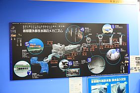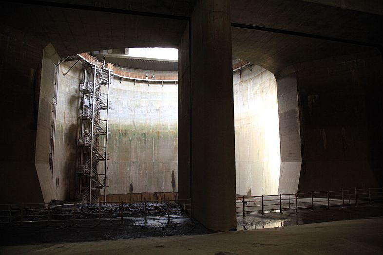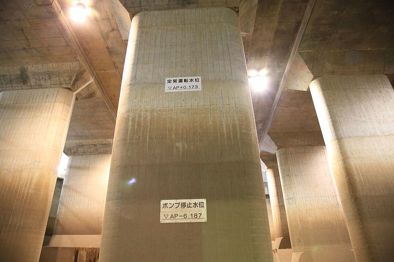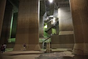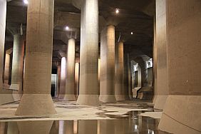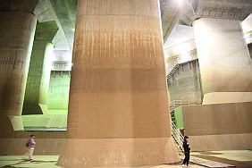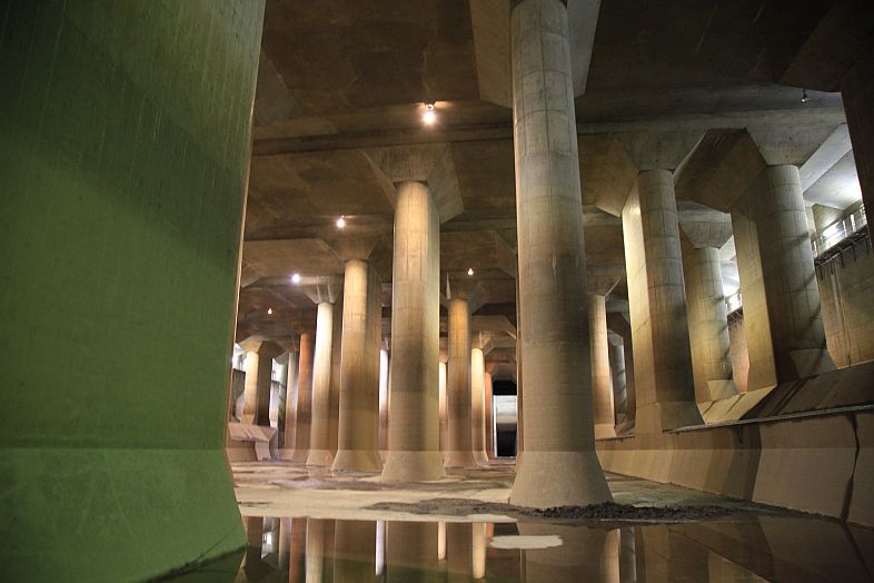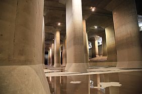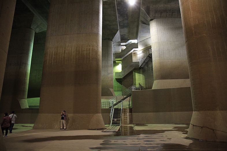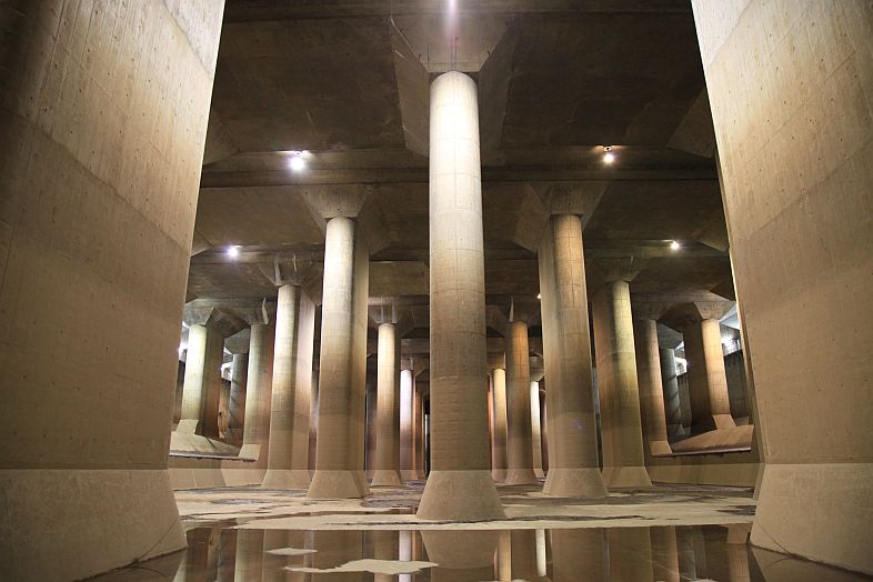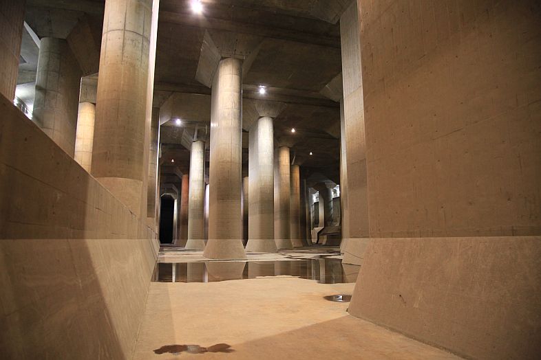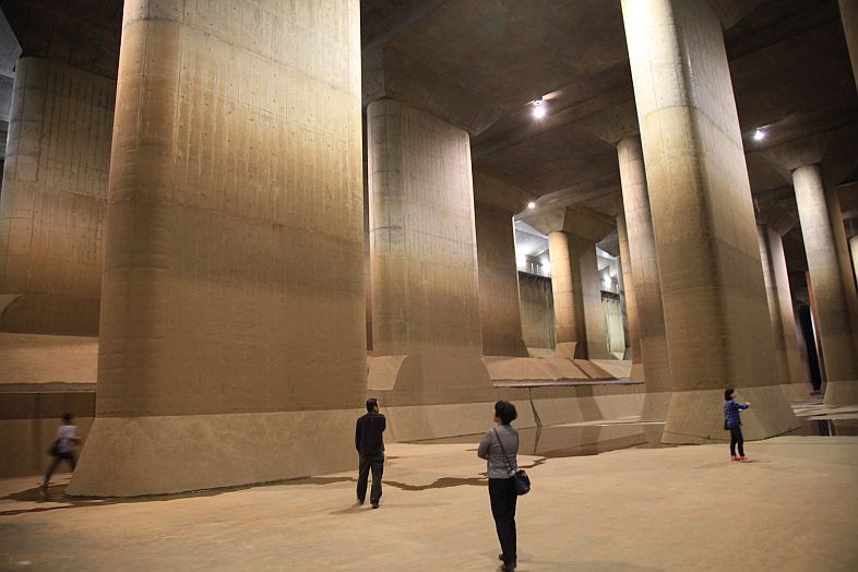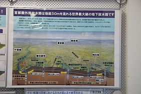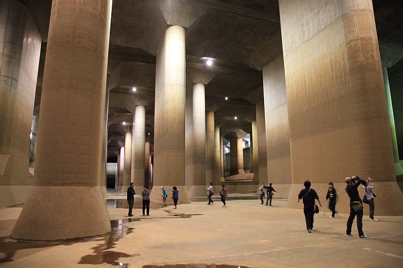 The Metropolitan Area Outer Underground Discharge Channel 首都圏外郭放水路 (Shutoken Gaikaku Housuiro) is the world's largest underground water discharge facilities (50 meter underground, 6.3 km long, water discharge rate 200 cubic meter per second) for flood prevention for the north east side (the flatter side) of Tokyo Metropolitan Area 首都圏.
