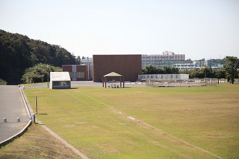 | Looking back at Ryuukyuukan 龍Q館 from the football pitch